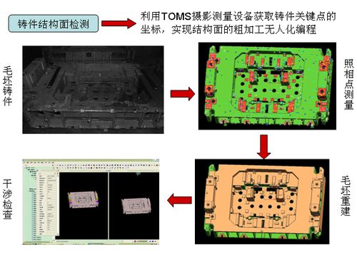 結構面編程完全依據CAD提供的(de)實體(tǐ),而機(jī)械車(chē)間(jiān)調用(yòng)編程者提供的(de)程序加工(gōng)的(d e)對(duì)象是(shì)鑄件(jiàn),在最理(lǐ)想的(de)狀态下(xià),鑄件(jiàn)與實體(tǐ)之•間(jiān)的(de)差别是(shì):在非加工(gōng)面上(shàng)鑄件(jiàn)比實體(tǐ)大(dà)或小(xiǎo)2~5mm,在₹加工(gōng)面上(shàng)鑄件(jiàn)比實體(tǐ)大(dà)10~15mm,但(dàn)在現(xiàn)實狀态下(xià),因受到×(dào)鑄造前和(hé)鑄造時(shí)很(hěn)多(duō)因素的(de)影(yǐng)響,鑄件(jiàn)與實體(tǐ)間(jiān)的(de)差别極不(bù)穩定,有∏(yǒu)時(shí)會(huì)差很(hěn)多(duō),按照(zhào)以前的(de)方法必須₹編檢測程序,還(hái)會(huì)造成空(kōng)走刀(dāo)的(de)情況,如(rú)果非加工(gōng)面變型大(dà)還(hái)會(huì)對(duì×)機(jī)床造成損傷,如(rú)果使用(yòng)TOMS攝影(yǐng)測量系統會(huì)測量出鑄件(jiàn)真實的(de$)情況,然後按照(zhào)測量結果更改程序,減少(shǎo)檢測程序的(de)編制(zhì)、提前發現(xiàn)鑄件(jiàn)問(×wèn)題做(zuò)出補救預案、減少(shǎo)空(kōng)走刀(dāo)、減輕機(jī)床的(de)負載、減少(shǎo)刀(dāo)具磨損、預防撞刀(∏dāo)等。